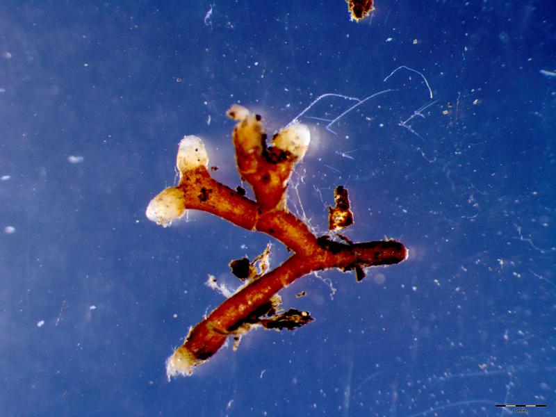 Mykorrhizapilz an einer Wurzel der Zirbelkiefer.