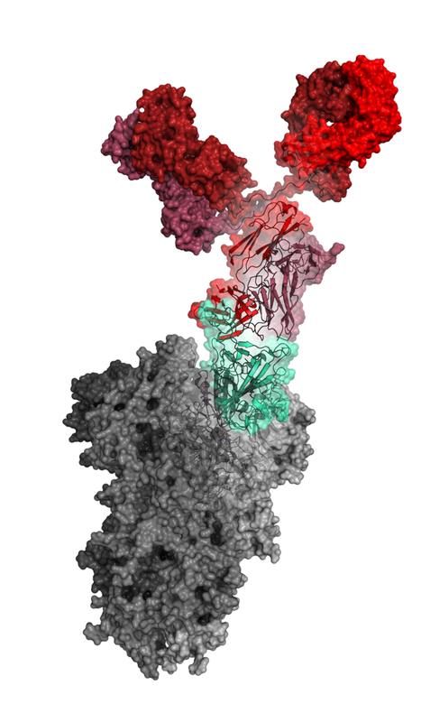 Structure of COR-101 (red) binding to the receptor binding domain (green) of the spike protein of SARS-CoV-2 (grey).
