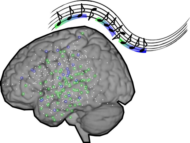 Die Noten stellen das untersuchte Paradigma dar: Die ersten Töne werden in anderen Bereichen des Gehirns verarbeitet als spätere, wiederholte Töne.