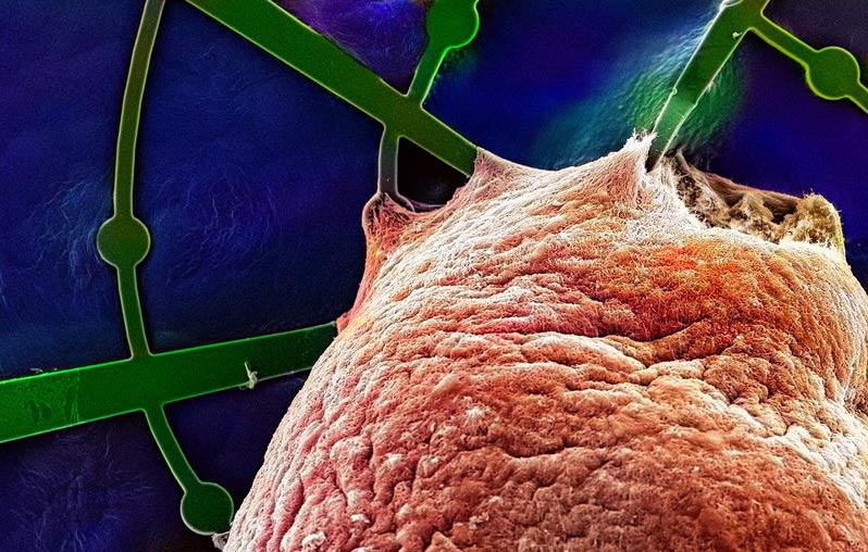 Der Schlüssel des aktuellen Erfolgs liegt darin, dass die Hirnorganoide die spinnennetzartige MEA-Netzstruktur umwachsen. Das konnte Dr. Katherina Psathaki vom CellNanOs der Universität Osnabrück mit dem Elektronenmikroskop zeigen. Sie analysierte die Hirnorganoide in ihrer Hängematte ein Jahr nach Beginn der Kultivierung. „Die Aufnahmen zeigen deutlich, dass sich die Hirn-Organoide in dieser Netzstruktur frei hängend entwickeln. So sind sie einerseits optimal mit Sauerstoff und Nährstoffen versorgt, und andererseits befinden sich die Mikroelektroden mitten in dem Hirnorganoid,“ ergänzt Thomas Rauen.