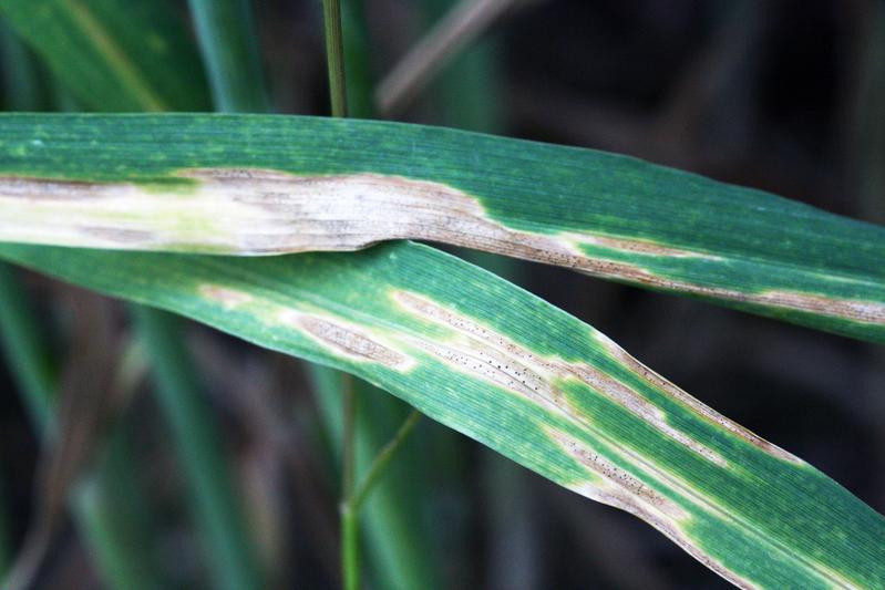 Ein mit dem Pilz Zymoseptoria tritici befallenes Weizenblatt zeigt die typischen Anzeichen der sogenannten Blattdürre, die zu drastischen Ernteausfällen führen kann.