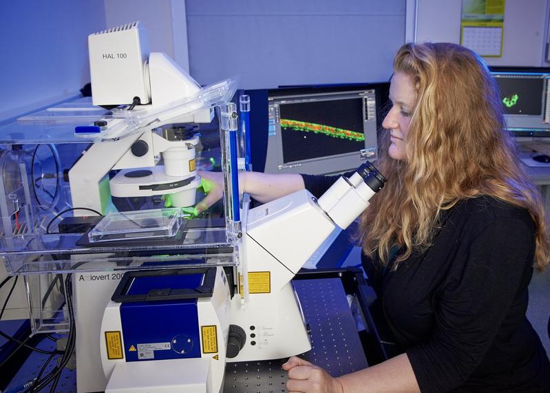 PD Dr. Jennifer Schön untersucht am Laser-Scanning-Mikroskop die Eileiterzellen.