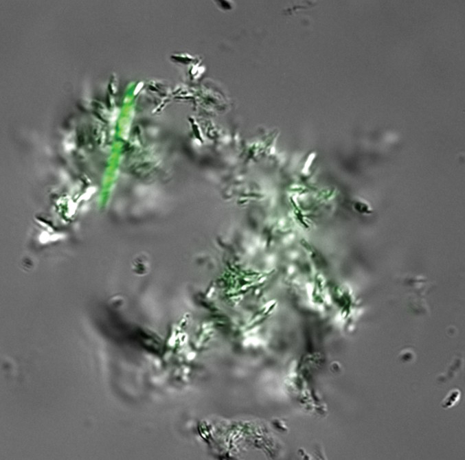 Fluoreszenzmikroskopische Aufnahme von DMN-Trehalose gefärbte Mycobacterium tuberculosis-Zellen.