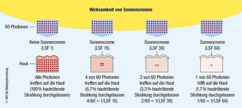 Die Abbildung zeigt den Anteil der hautrötenden Strahlung, welche ungeschützte Haut erreicht (Lichtschutzfaktor oder LSF = 1) bzw. durch Sonnencremes (mit LSF 15, 30 und 60) durchgelassen werden und auf die Haut auftreffen. Der LSF einer Creme ist definiert als das Verhältnis der hautrötenden Sonnenstrahlendosis, welche die erste wahrnehmbare Hautrötung auf geschützter Haut hervorruft, im Vergleich zur hautrötenden Sonnenstrahlendosis, welche die gleiche Hautrötung auf ungeschützter Haut auslöst. Die Prozentzahl der durchgelassenen hautrötenden Strahlung hängt direkt mit dem LSF zusammen (% = 1/LSF): Wenn der LSF sich verdoppelt, halbiert sich die Strahlendosis (Anzahl Photonen), welche in die Haut eindringt und schädigt.