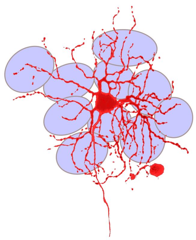 Gefärbte Nervenzelle der Netzhaut in rot, zusammen mit elliptischen Bereichen, die die Umrisse vorgeschalteter Nervenzellen anzeigen.
