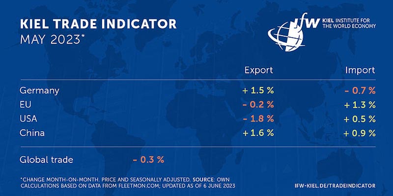 Kiel Trade Indicator 05/23: Der Welthandel tritt im Mai auf der Stelle. Die Entwicklung großer Volkswirtschaften ist von nur moderaten Veränderungen bei Importen und Exporten geprägt (Vergleich zum Vormonat, preis- und saisonbereinigt). Dies zeigt das jüngste Datenupdate des Kiel Trade Indicator. Weltweit steigt die Menge verschiffter Container. Trotz jüngst starker offizieller Zahlen werden deutsche Exporte durch den Chinahandel zunehmend belastet. Das jüngste Datenupdate des Kiel Trade Indicator für Mai weist für den Welthandel im Vergleich zum Vormonat April einen Rückgang…