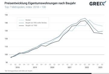 Neubaupreise relativ stabil. Ein Vergleich der Preisentwicklung von Eigentumswohnungen nach Baujahr in Deutschlands größten Metropolen zeigt: Ausgehend von den Höchstständen sind die Preise für Neubauten bislang nur verhältnismäßig moderat zurückgegangen, der Einbruch bei Bestandsimmobilien war mehr als doppelt so hoch. Dies geht aus einer Datenanalyse des German Real Estate Index (Greix) hervor. Der Index ist ein Projekt von ECONtribute und des IfW Kiel. In Kooperation mit lokalen Gutachterausschüssen werden die tatsächlichen Verkaufspreise deutscher Immobilien nach aktuellen wissenschaftlichen Standards ausgewertet. Alle…
