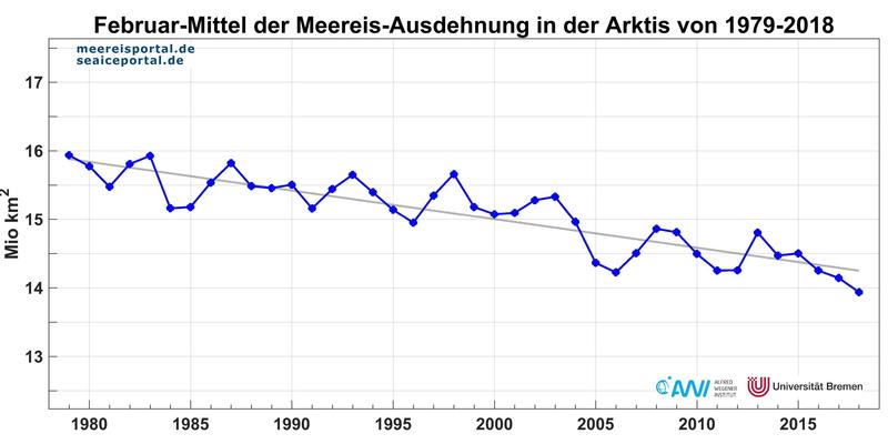 Monatsmittelwerte der Meereisausdehnung im Februar in der Arktis der Jahre 1979-2018
