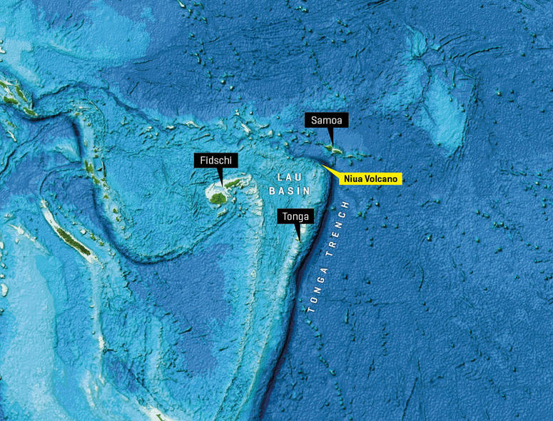 Das Hydrothermalfeld am Niua-South-Vulkan liegt im Lau-Becken zwischen Fidschi und Samoa. Image reproduced from the GEBCO world map 2014, www.gebco.net