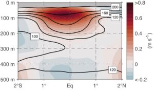 Der atlantische äquatoriale Unterstrom (EUC) bei 23°W. Mittlere Strömungsgeschwindigkeit (Farben in m/s) und Sauerstoffverteilung (Konturlinien in μmol/kg). Die Dunkelroten Farben markieren den Kern des EUC in etwa 80 m Tiefe. Nach Brandt et. al, 2021