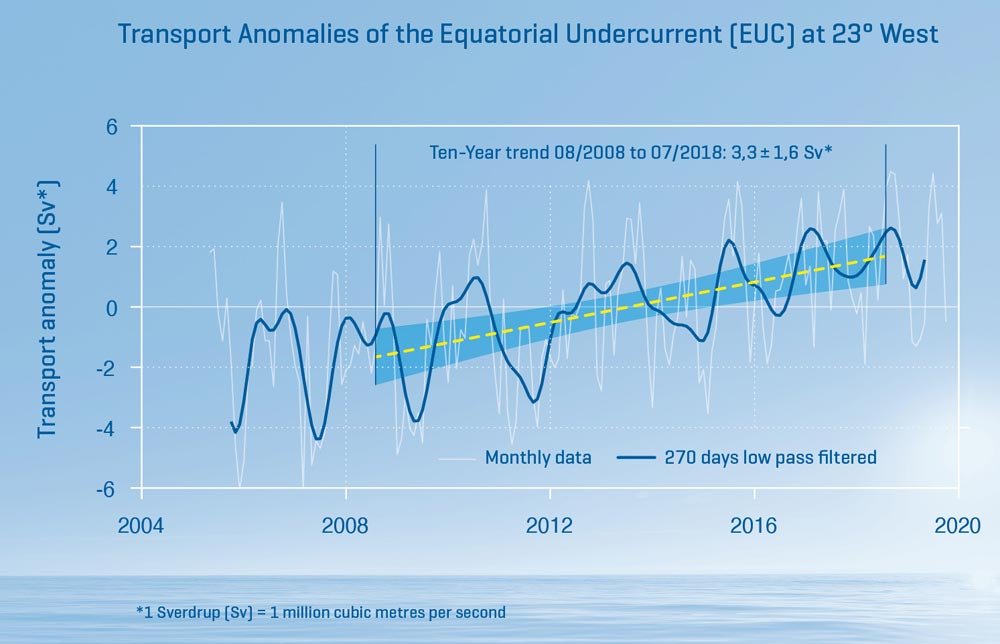 Direkt am Äquator befindet sich eine der stärksten Strömungen, der Äquatoriale Unterstrom (EUC), der Wassermassen ostwärts quer über den Atlantik transportiert. Der EUC transportiert hierbei etwa 60-mal mehr Wasser als der wasserreichste Fluss der Erde, der Amazonas. In Zusammenarbeit mit dem internationalen PIRATA Programm untersuchen Wissenschaftler*innen des GEOMAR schon seit Jahren Schwankungen dieser Strömung. Sie benutzen dazu ortsfeste Beobachtungsplattformen, sogenannte Verankerungen, die in regelmäßigen Abständen während Forschungsexpeditionen gewartet werden müssen.