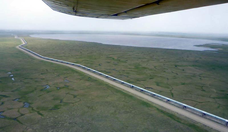 An oil pipeline crosses the tundra, Prudhoe Bay oil field, northern Alaska. (Foto: Guido Grosse)