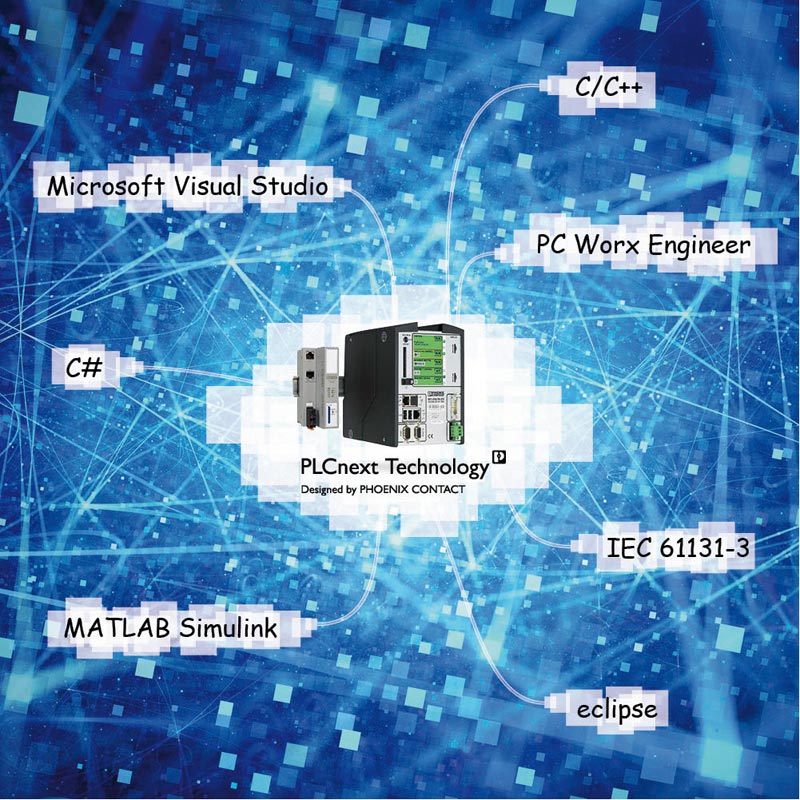 Vor diesem Hintergrund stellt Phoenix Contact zur SPS IPC Drives 2016 eine neue, offene Steuerungsplattform auf Basis der innovativen PLCnext Technology vor. Die Lösung erlaubt das parallele Programmieren auf Basis etablierter Software-Tools, wie Visual Studio, Eclipse, Matlab Simulink und PC Worx sowie die frei wählbare Verknüpfung von deren erstelltem Programmcode.