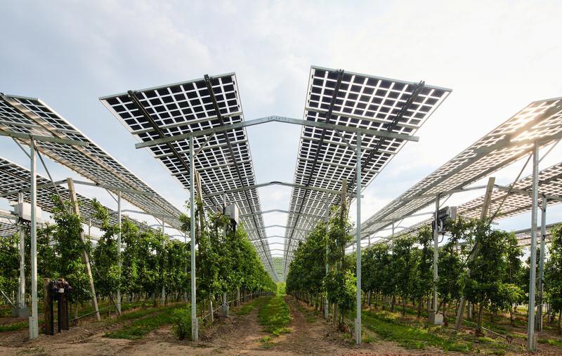 Agri-Photovoltaik-Anlage über Apfelbäumen
