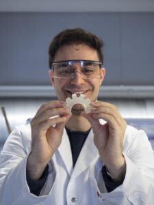 Empa-Forscher Christopher Bascucci demonstriert ein weiches Material, das mit keramischen Sensoren versehen werden kann.