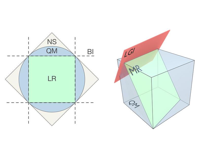 Links: Alle vernünftigen physikalischen Theorien, die Quantenmechanik (QM) eingeschlossen, gehorchen der „no-signalling“ (NS) Annahme. Lokaler Realismus (LR) ist durch die Bell’schen Ungleichungen (BI) eng eingegrenzt, die somit ein optimales Werkzeug für experimentelle Tests darstellen. NS, QM, und LR befinden sich in einem Wahrscheinlichkeitsraum der gleichen Dimension, hier der Einfachheit halber in zwei Dimensionen gezeichnet. Rechts: Ein ganz anderes Bild ergibt sich für den makroskopischen Realismus (MR). Hier haben die Wahrscheinlichkeitsräume von MR und QM unterschiedliche Dimensionen. Die Leggett-Garg-Ungleichungen (LGI) sind Schnitte durch den QM-Raum und grenzen MR nicht eng ein. Daher sind LGI nicht optimal für experimentelle Tests des MR. MPQ, Abteilung Theorie