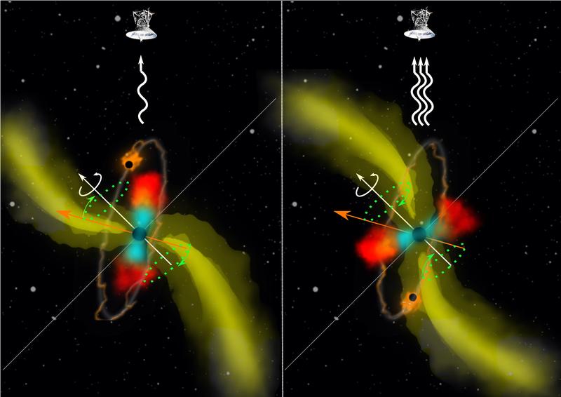 Abbildung 1 zeigt die Präzessionsbewegung eines magnetisierten Jets im Radiobereich (gelb), hervorgerufen durch ein supermassereiches binäres Schwarzes Loch im Zentrum der Galaxie. Das schwerere der beiden supermassereichen Schwarzen Löcher (in Schwarz) befindet sich im Zentrum einer Akkretionsscheibe, die sowohl wärmeres (blau) als auch kühleres (rot) Gas enthält. Der weiße Pfeil zeigt den Spin des größeren Schwarzen Lochs an. Das zweite Schwarze Loch (orange) kreist um das zentrale supermassereiche Schwarze Loch, und der orangefarbene Pfeil zeigt die Ausrichtung seines Bahndrehimpulses an. Aufgrund der unterschiedlichen Ausrichtung treibt das Drehmoment des zweiten Schwarzen Lochs die Präzession der Akkretionsscheibe und des ausgestoßenen Jets an (grüner Kreis und Pfeile). Die Radioemission ist mit weißen gekrümmten Linien dargestellt. Ein Radioteleskop zeigt die Richtung zum Beobachter auf der Erde. Die beiden Bilder veranschaulichen, wie der Jet herumwirbelt und die Variationen in der Radioemission erzeugt. Der Jet im rechten Bild ist dem Beobachter zugewandt und erscheint daher heller am Himmel – damit geht auch eine stärkere Radioemission einher.